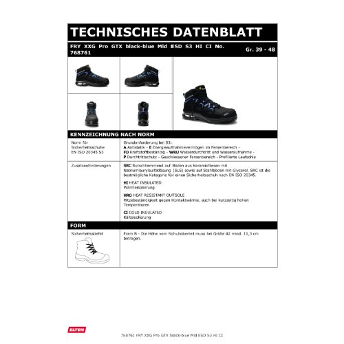 | Norm: | EN ISO 20345 S3 HI/HRO/CI/SRC, Form B |