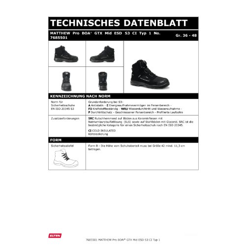 Eigenschaften "ELTEN Sicherheitsstiefel MATTHEW Pro BOA® GTX Mid ESD S3S CI Typ 1 7685501-44"