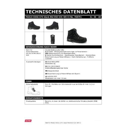 Eigenschaften "ELTEN Sicherheitsstiefel PAOLO XXSG GTX black Mid ESD S3S WR CI 768791-47"