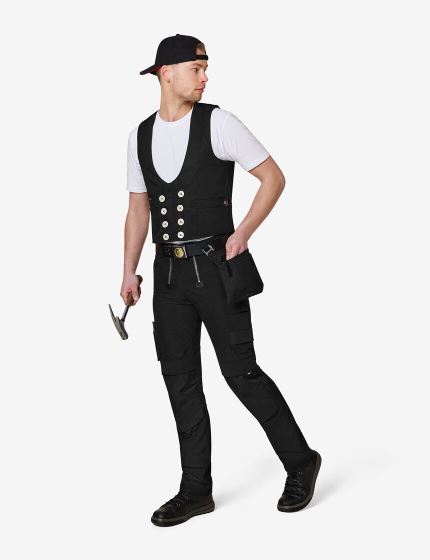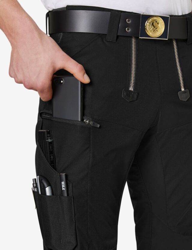 Die Hose kombiniert Strapazierfähigkeit mit Flexibilität, perfekt für Zimmerer und Dachdecker. Ausgestattet mit einer Reißverschluss-Handytasche, einer dehnbaren Volumentasche mit Magnetknopf und zwei Gesäßpattentaschen. Zertifizierter Knieschutz nach DIN EN 14404 Typ 2, Leistungsstufe 1 (nur mit FHB Knieschutz Casper).