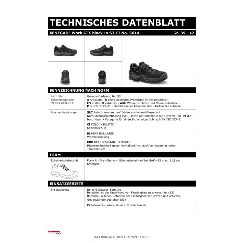 Eigenschaften "LOWA Sicherheitshalbschuh RENEGADE Work GTX black Lo S3S CI 5614-46"